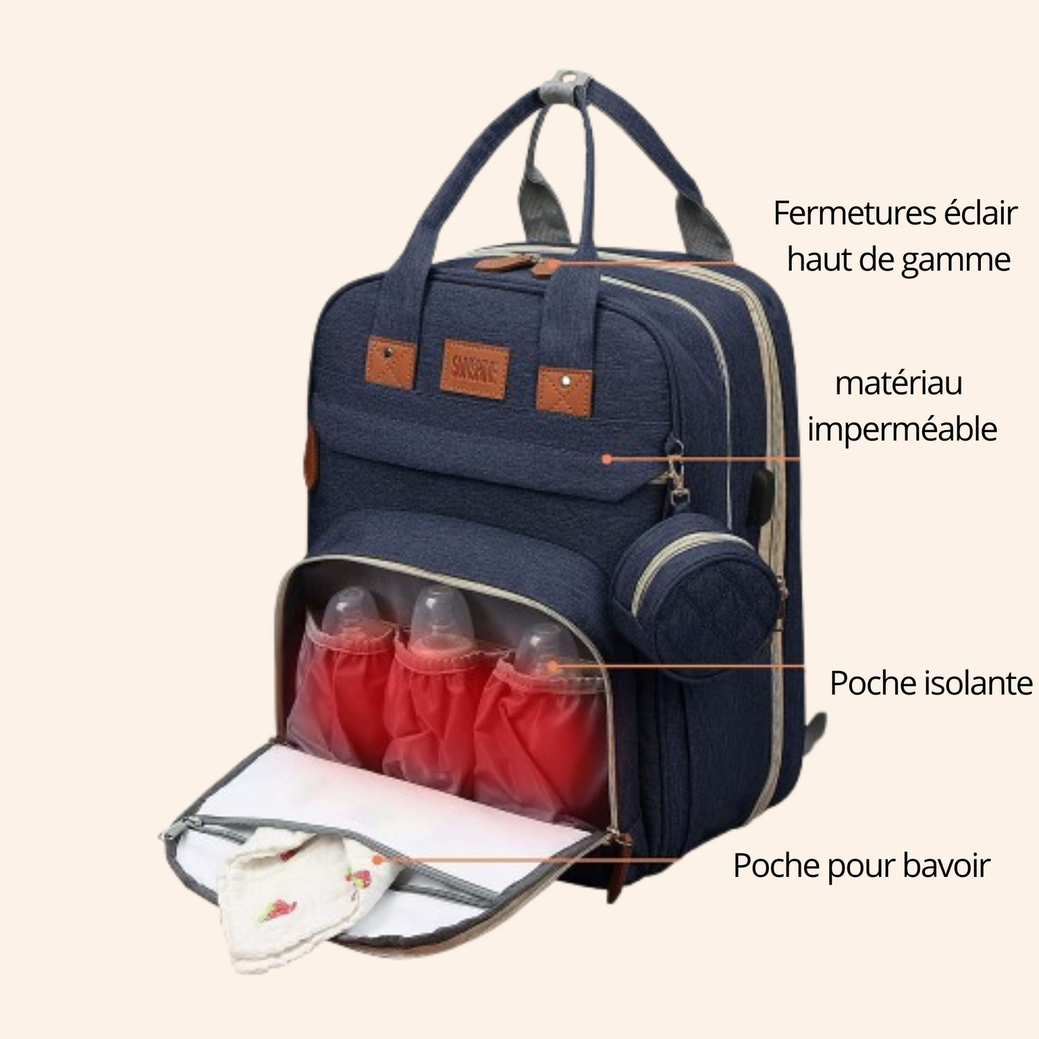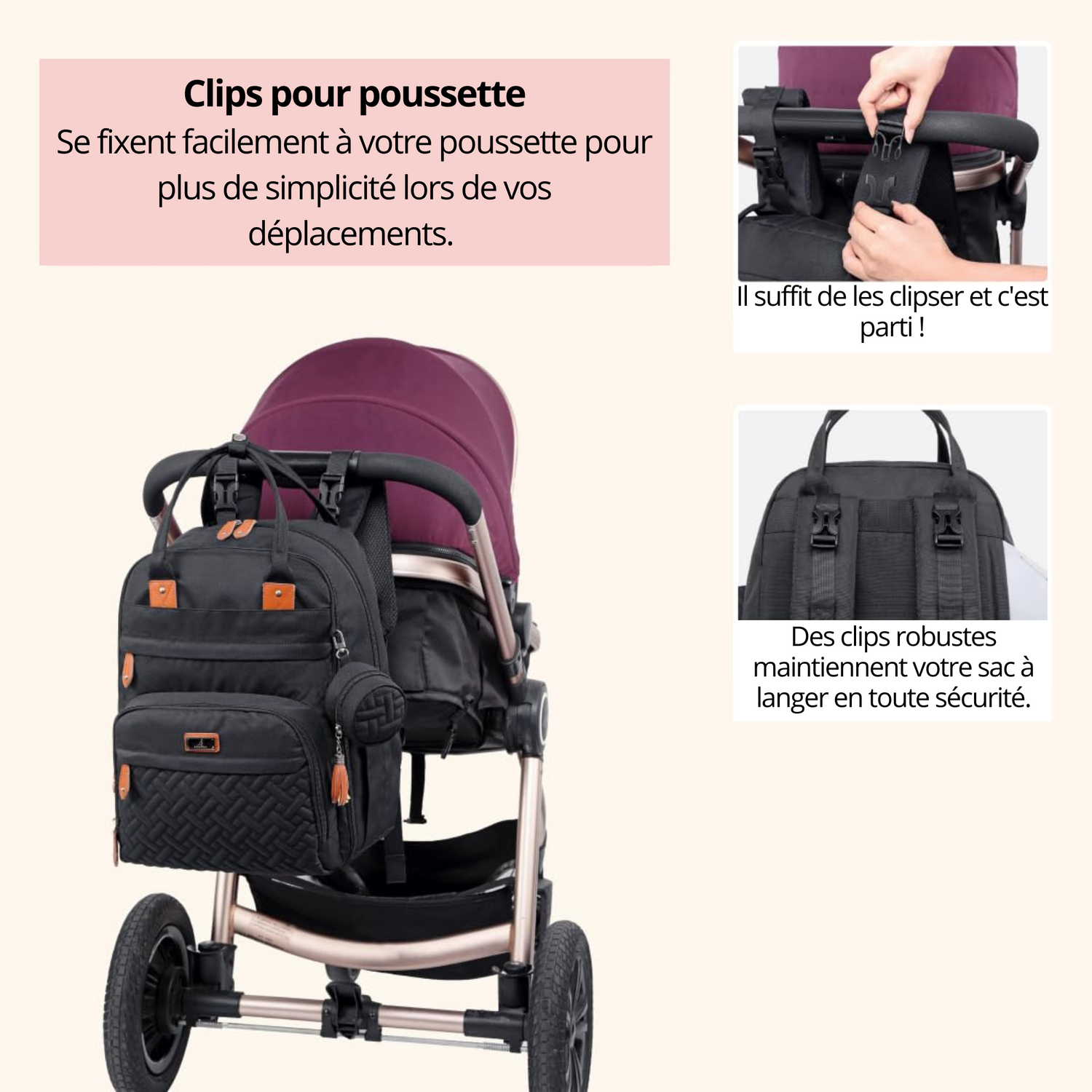 Il est suffisamment grand pour transporter tout le nécessaire de bébé (couches, vêtements, biberons, jouets), tout en restant compact et élégant.